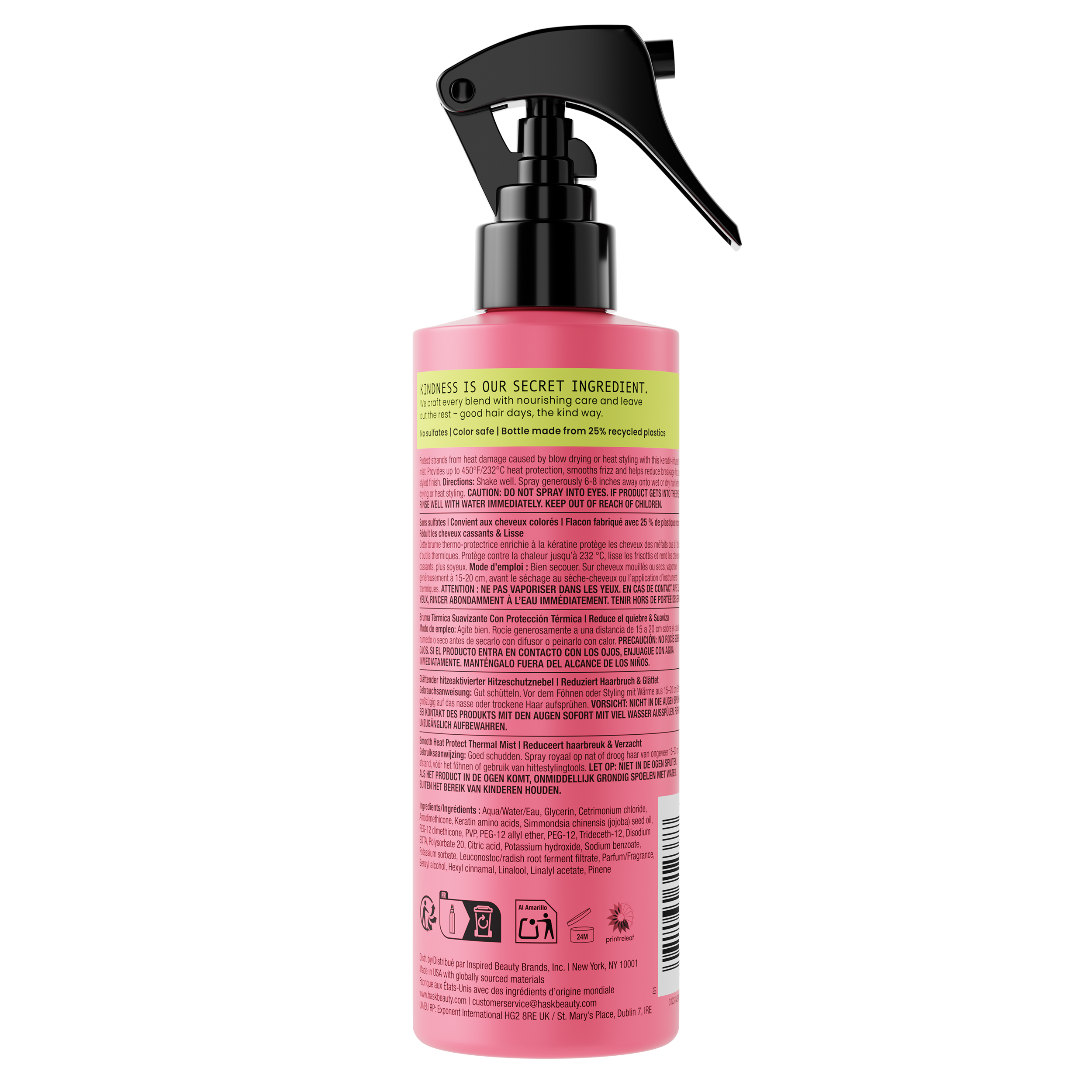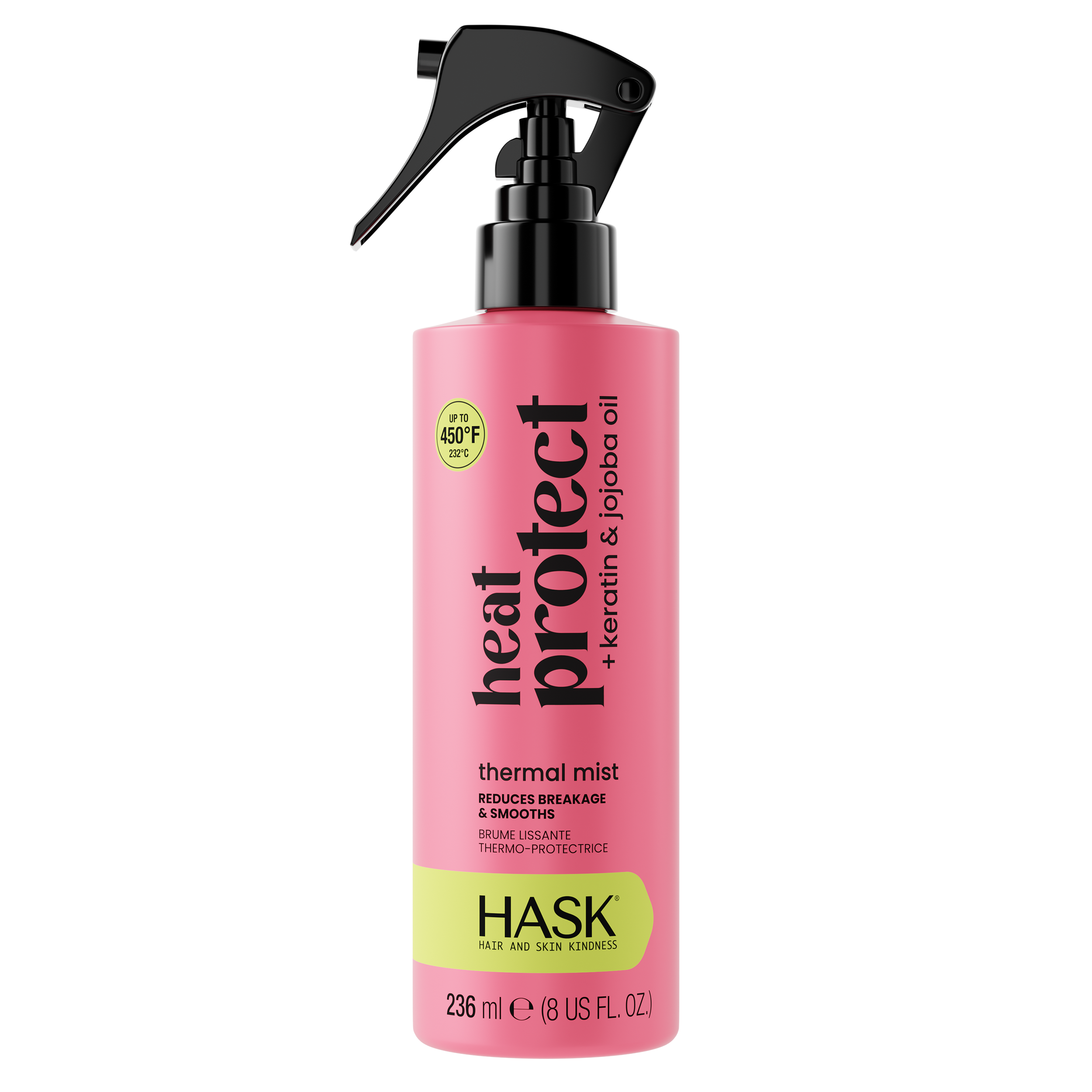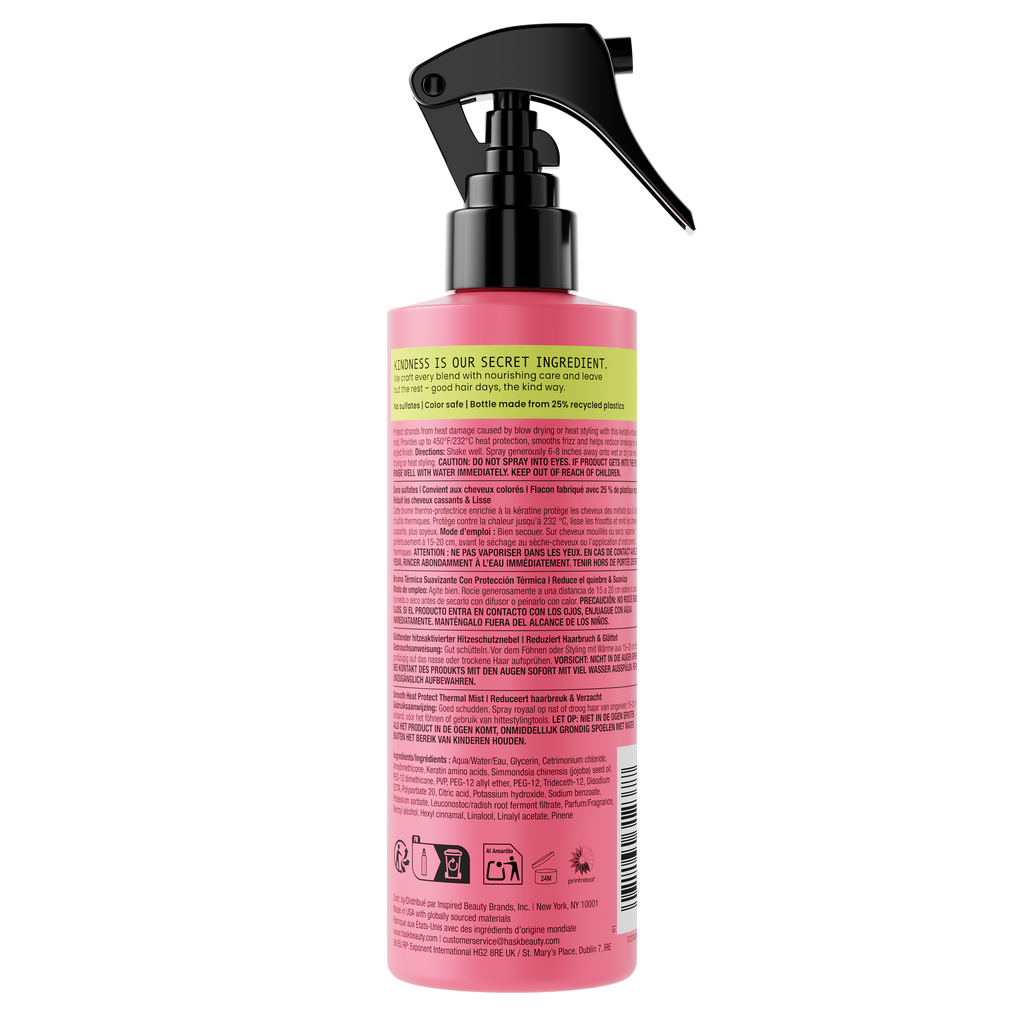 Protect your strands while turning up the heat. The HASK Smooth Heat Protect Thermal Mist provides heat protection up to 450°F/232°C to defend hair against damage from blow dryers, flat irons, and curling wands. This ultra-fine mist infused with keratin and jojoba oil smooths frizz, helps reduce breakage, and leaves hair sleek, strong, and ready to style without weighing hair down.